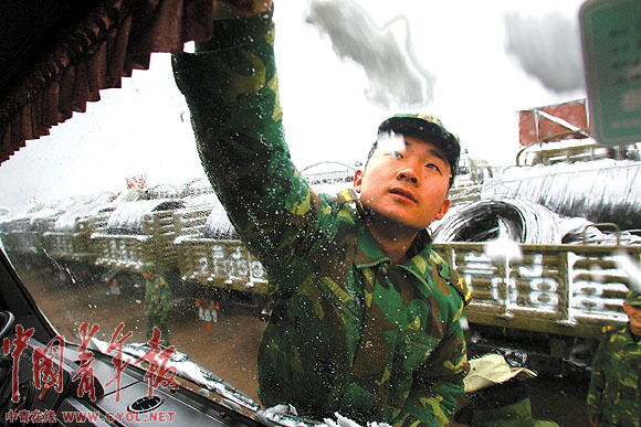 ▲5月12日清晨,沱沱河边,战士出发前,清理车窗上的积雪。