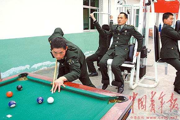 ▲当雄兵站文化生活阳光棚里,一名士兵正在打台球。