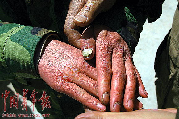 ▲5年来一直坚守唐古拉泵站的刘俊今年才23岁,由于严重缺氧和长期跟汽油打交道,他的手严重变形,指甲凹陷。