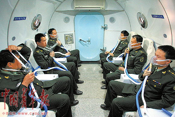 ▲战士们在高压氧舱里吸氧。