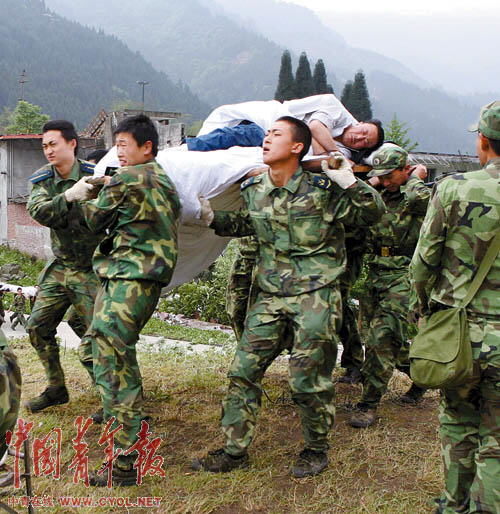 照片:5月15日,成都军区某部官兵在地震灾区抢运伤员(资料照片)。 本报记者 晋永权摄