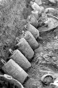 安徽省文物部门近日首次对外公布了蚌埠双墩1号墓的初步考古发现。从墓葬的规模葬制看,该墓为春秋时代诸侯王级墓葬。在该墓中首次发现了五色颗粒混合土、白土垫层、填土构成的放射线遗迹和土偶遗迹,其圆形墓坑结构、墓底埋葬布局等在全国也属罕见。目前,安徽省文物部门正在进一步发掘,以确定墓主身份并进行其他相关研究。图为安徽蚌埠双墩春秋古墓中发掘的编钟。