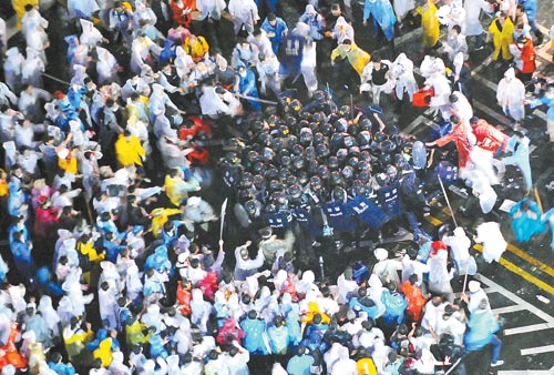 6月29日,在韩国首都首尔,抗议人群将防暴警察围在中央。当天,韩国民众继续举行大规模示威活动,抗议政府恢复进口美国牛肉。