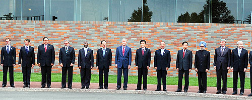 照片:7月9日,胡锦涛在日本北海道洞爷湖出席八国集团同发展中国家等领导人对话会议。这是领导人集体合影。新华社记者 樊如钧摄