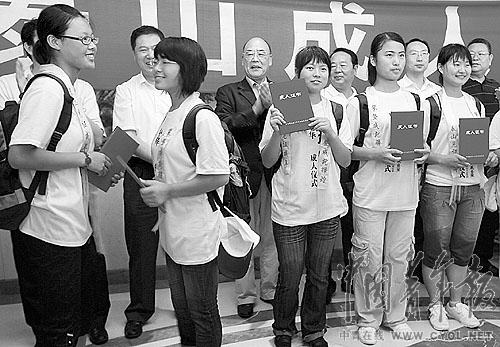 7月9日,来自四川北川灾区的学生代表欣慰地接过成人仪式证书。当日,在由山东省旅游局、泰安市人民政府、中国青年报社等单位共同主办的“中华泰山成人仪式”上,来自北川中学的学生和北京、山东等地的200名大中学生共同举手宣誓。北川学生代表表示,参加成人仪式,对于鼓舞他们增强信心、重建家园具有重要意义。山东省政协副主席王久祜和中国青年报社副社长宁光强为“泰山成人仪式宣誓基地”揭牌。 本报记者 郑萍萍摄