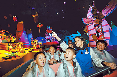 7月9日,来自四川彭州市磁峰镇的学生在香港迪士尼乐园亲善大使罗慧沁带领下畅游乐园的“小小世界”。