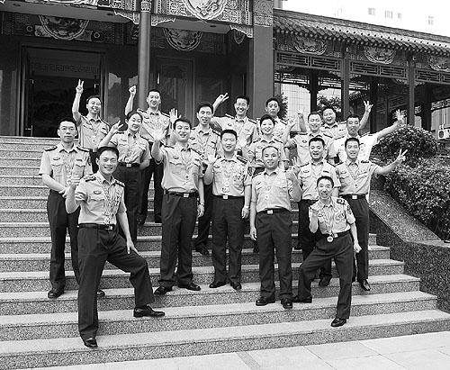 照片:最新出炉的全军18位优秀青年标兵:(从左至右)陈金宝、邓红洲、陈国韬、朱毓姝(女)、贾和平、洪流、李剑、向南林、徐壮志、何祥美、王梅(女)、伦珠、卓张明、冯志峰、董世民、罗先国、曹升文、马庆忠 尹虹宇摄