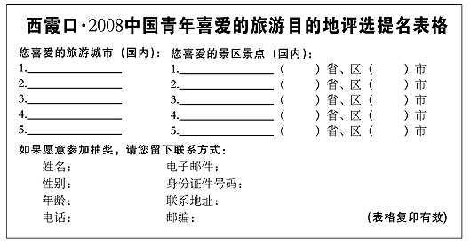 即日起,读者可通过以下方式参与“西霞口·2008中国青年喜爱的旅游目的地”评选第一阶段的投票。