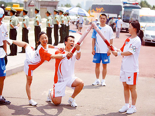 照片:7月11日,火炬手刘海颖(右)与申雪(左)、赵宏博(中)交接。新华社记者 邢广利摄