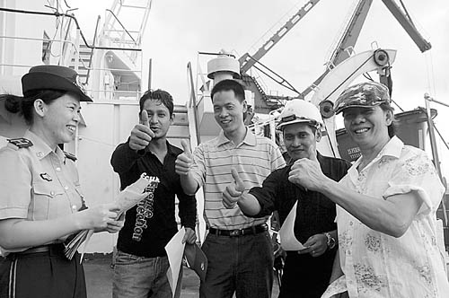 7月17日,广东边防总队新会边防检查站官兵向外籍船员介绍奥运加油手势。为迎接北京奥运会的召开,新会边检站广泛开展了“迎奥运、讲文明、树新风”系列活动,组织官兵学习奥运知识,举办职业礼仪培训,加强奥运安保演练。