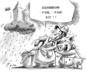 房地产市场不景气,开发商欠债难还,重庆几个建筑老板合伙办起了养猪场。漫画:徐简
