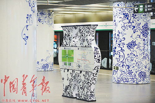 中图:奥运支线地铁的起点——10号线北土城路站,站台以中国传统的青花瓷为设计理念,墙、柱和线路出口指示牌上都描绘着淡蓝色或黑色的素胚花纹,极具瓷器的质感。