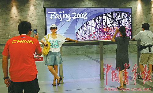 下图:北京地铁10号线一处车站,往来的乘客纷纷在“鸟巢”前驻足留影。