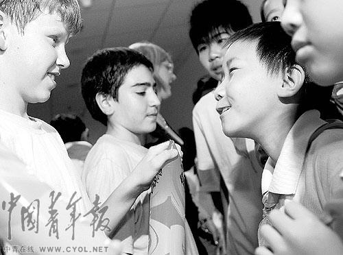 7月25日,来自北川灾区的小学生和北京加拿大国际学校的外籍学生互作自我介绍。当天,由中国青少年发展服务中心主办的“手拉手爱心行动”交流演出在该校举行,来自北川羌族自治县的35名师生自信地走上舞台,露出久违的笑脸。作为爱心行动的第一批师生,他们在京接受了系统的心理健康辅导和安全自护知识培训。 本报记者 郑萍萍摄
