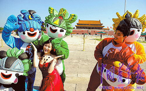 ▲天安门广场上,来自上海的女歌唱演员演出后与“福娃”合影。