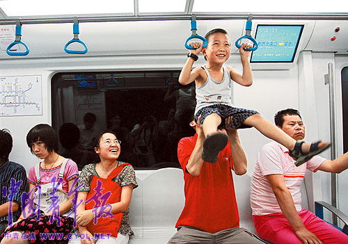 ▲一个小朋友在新开通的北京10号线地铁里玩起吊环。奥运前夕,地铁10号线(一期)、奥运支线和机场线开通,预计奥运期间,北京地铁线网日均客流量将达到500万。