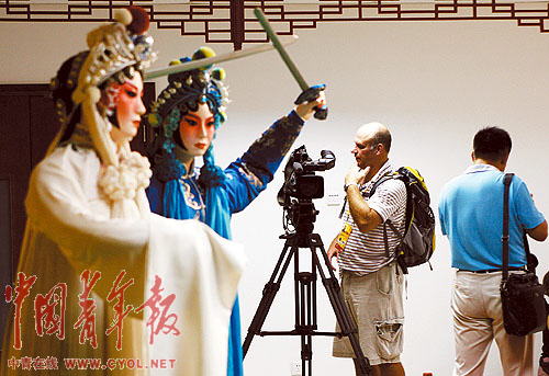 ▲中国国家京剧院内,一位来采访北京奥运会的外国记者被“京剧服饰文化展”吸引。