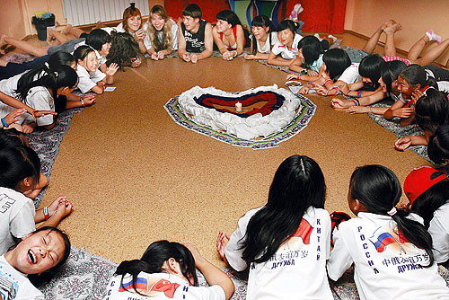 8月4日,在俄罗斯“海洋”全俄儿童中心,来自中国四川地震灾区的孩子们和俄罗斯辅导员共同参加告别晚会。当天是中国孩子们在“海洋”全俄儿童中心为期3周休养的最后一天,中俄两国儿童共同度过了一个难忘的夜晚。 新华社记者 郑悦摄