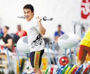 8月6日,中国举重运动员廖辉在训练前热身。当日,中国举重队在北京航空航天大学举重训练馆进行了首次训练。 新华社记者 杨磊摄