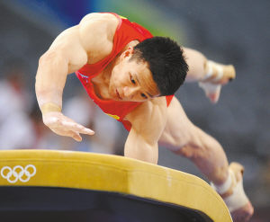 8月6日,中国男子体操选手陈一冰进行跳马训练。当日,中国男子体操队在国家体育馆进行赛台训练。 新华社记者 程敏摄