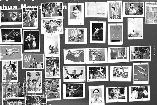 北京国际新闻中心,不断增加的奥运新闻图片几乎贴满了一面展示墙。本报记者