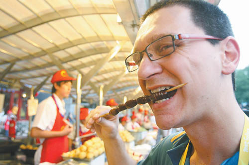 ①外国游客在北京东华门夜市品尝中国传统小吃。陈晓根摄(新华社发)