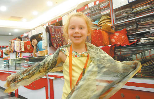②在北京红桥市场,一名美国小游客身披丝巾兴奋地跳舞。许多国外游客以及参与奥运会的运动员、教练员,感受中国文化,享受北京购物乐趣。新华社发