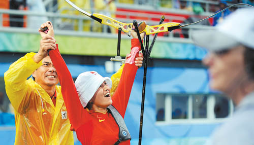 8月14日,中国选手张娟娟与教练(左)庆贺胜利。当日,在奥运会射箭女子个人决赛中,张娟娟以110环∶109环战胜韩国选手朴成贤,获得冠军。新华社记者 格桑达瓦摄