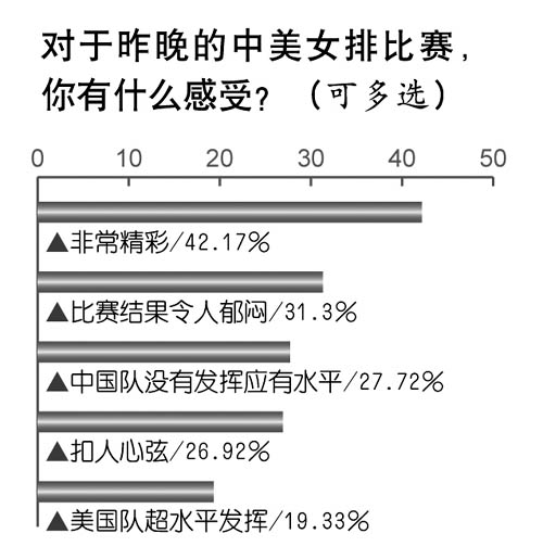 调查显示,42.2%的网友肯定中美女排的比赛非常精彩;26.9%的网友表示简直是“扣人心弦”。27.7%的人感觉中国队没有发挥应有水平,也有19.3%的人认为美国队超水平发挥。同时,31.3%的人承认比赛结果令他们感到“郁闷”。