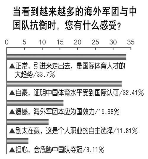 据悉,北京奥运会海外军团之多,已创历届奥运会之最。当看到越来越多的海外军团与中国队抗衡时,33.7%的公众认为这是正常现象,体育人才“引进来,走出去”是国际体育大趋势;32.4%公众对此感觉自豪,认为这证明中国体育水平受到国际认可;有11.8%的人表示不在意,认为这是个人职业的自由选择。但是,也有16.0%的人表示遗憾,坚持海外军团应该为国效力;还有6.1%的人对此表示担心,怕威胁中国队夺冠。