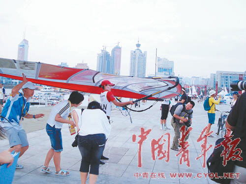 | 中国女子帆板名将殷剑每次上岸后都要从记者中突围。本报记者 张国摄 |