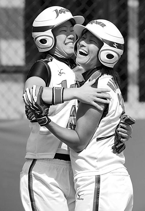 8月16日,日本队在北京奥运会女子垒球预赛中,以3∶0战胜中国队。图为日本球员西山丽(左)和马沿智子拥抱庆贺。