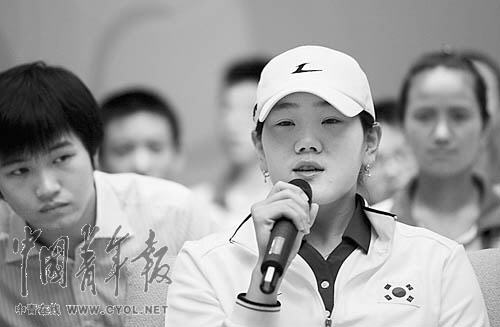 8月16日,北京奥运会韩国女子射箭团体冠军成员之一朴成贤与中国青少年面对面交流。本报记者 赵青摄