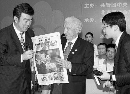 萨马兰奇今天收到的最后一份礼物是一份当天的《中国青年报》,中国青年报总编辑陈小川说:“我是办报纸的,我的礼物只有报纸。只要您出现在我们的封面上,您就是我们的新闻人物。”88岁的萨翁说,他非常感激中国青年报给他提供了这样一次机会,坐在年轻人中青春了一回。