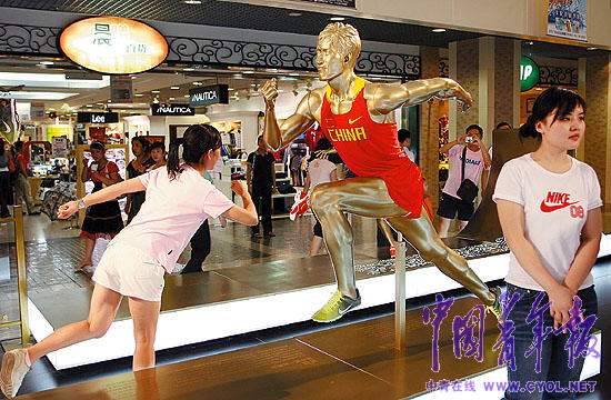 8月17日,在北京一处展示中国运动员比赛服装的模特前,一位女孩正摆出相同的运动姿势留影。奥运会期间,人们尽情地享受着运动带来的乐趣。 本报记者 赵青摄