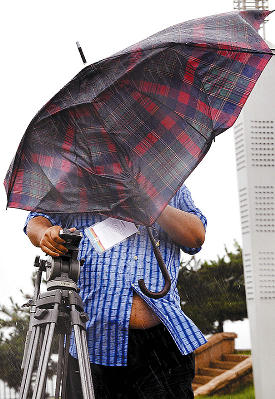 照片:8月17日,一名记者的伞被风吹变形。当日,受降雨影响,奥帆赛多个项目比赛改期。新华社记者 朱峥摄