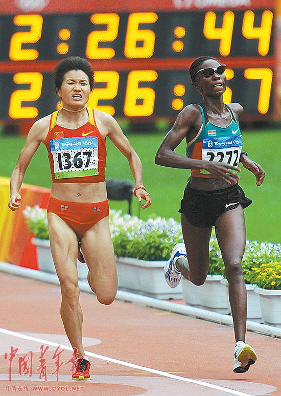 照片:8月17日,中国选手周春秀(左)在北京奥运会女子马拉松比赛中获得第三名。 本报记者 刘占坤摄