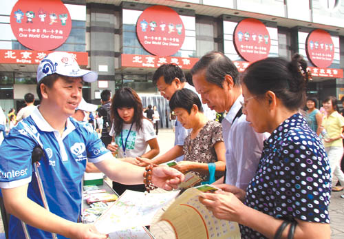 8月27日,北京图书大厦城市志愿者站点迎来了两名特殊的志愿者,他们是残疾人城市志愿者张子江和李轶。两人的班次安排本来应该在残奥会开始后,但奥运会一闭幕,他们便希望到站点提前体验城市志愿服务工作。图为志愿者李轶向游客发放文明观赛指南。