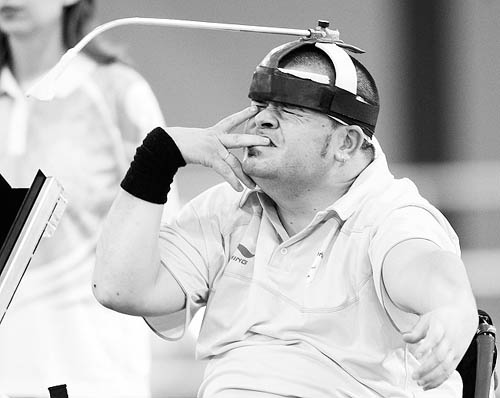 9月12日,硬地滚球BC3级混合双打决赛,西班牙选手圣地亚哥·佩斯克拉在比赛中对自己打出的球很不满意。