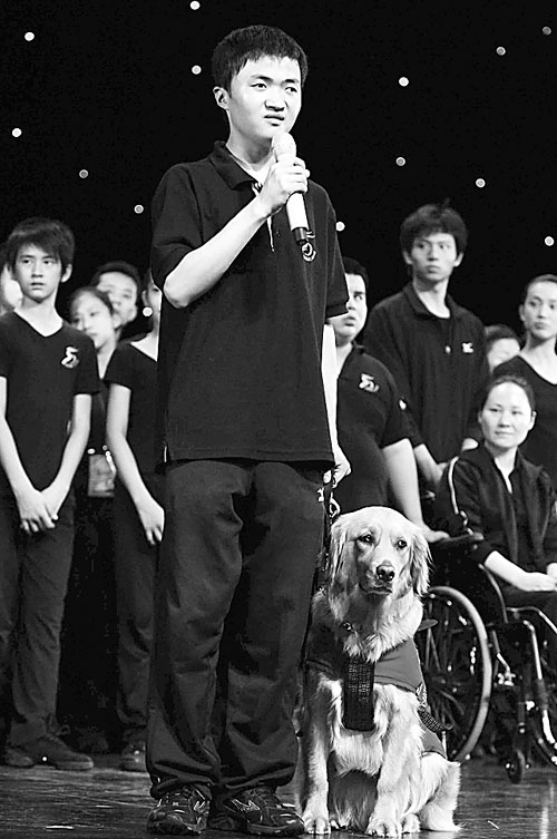 今天是中秋节,中国残疾人艺术团要在保利剧院演出3场—和所有剧团一样,越是节假日,他们越是忙累。17岁的王宾是残疾人艺术团的盲人演员,两岁的“妞妞”是王宾的导盲犬—一条漂亮的金毛猎犬。