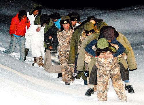 西藏山南军分区某边防团的官兵从错那镇吉乌湖牧场救出被困群众(10月31日摄)。10月下旬,西藏山南地区隆子、错那等五县发生了历史罕见暴雪灾害。西藏山南军分区在第一时间组织官兵深入重灾区,配合当地政府全力参与抗雪救灾工作。杨超摄(新华社发)