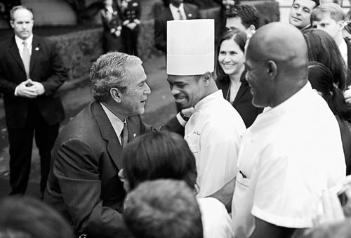 11月6日,美国总统布什(左)在华盛顿白宫南草坪与工作人员见面。美国总统布什当日说,他将于10日与当选总统奥巴马在白宫会谈,主要议题包括金融危机和伊拉克战争。