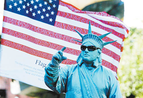 美国劳工部11月7日公布的数据显示,美国非农业部门就业岗位10月份减少24万个,失业率上升至6.5%,为1994年3月以来的最高点。这是2008年10月2日在美国纽约炮台公园,一名男子装扮成自由女神像的模样,招徕游客与其合影,以赚取小费。