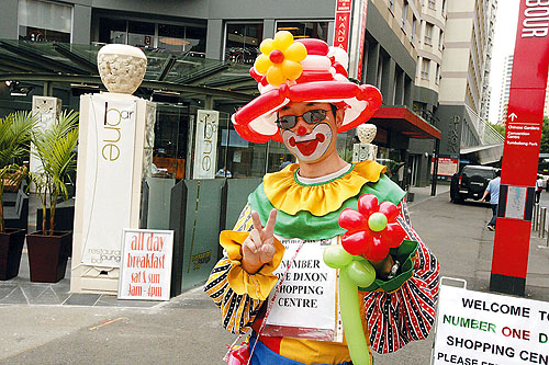 12月24日,在澳大利亚悉尼市中心,装扮成小丑的促销员在招揽顾客。受金融危机影响,今年圣诞期间澳大利亚最大城市悉尼的各大商场比较冷清。 姜长庚摄(新华社发)