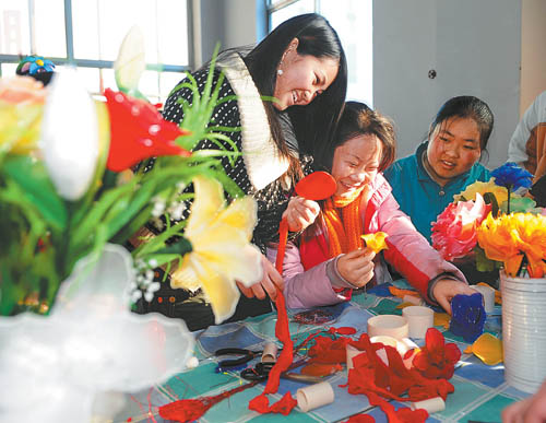 12月25日,几名返乡人员在朔州市一处培训中心学习制作手工艺品。