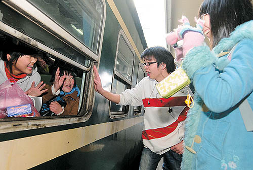 照片:1月10日,四川地震灾区学生在火车上和南昌的朋友告别。当日,50多名来自四川省小金县的学生告别江西南昌,踏上回乡旅程。当地媒体为学生们购买了返乡的火车票。 袁征摄(新华社发)