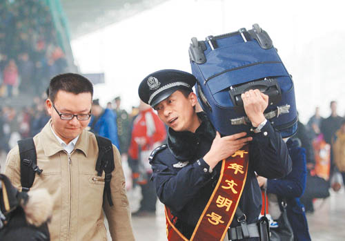 1月16日,一名参加“暖春”行动的重铁警方民警正在帮一名乘火车回家的学生搬运行李。为帮助春运期间出行旅客平安回家,重庆铁路警方日前正式启动“暖春”行动,在重庆火车站和重庆北火车站成立了“护送服务、换乘引导、法律咨询、应急医疗”小分队,确保旅客到达和出行的平安。