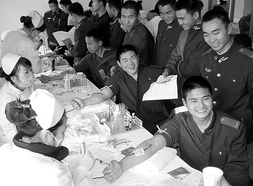 1月31日,来自四川地震灾区的武警战士王昊(前右)等正在义务献血。当日是农历大年初六,武警江西总队南昌市支队机动大队120余名官兵积极参加义务献血活动,献血量近5万毫升,以缓解南昌市血库告急的情况。