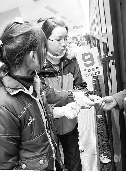 2月2日,担任L720次列车值乘任务的大学生志愿者在宜春火车站为乘客检票。从大年初四起,江西宜春学院的34名大学生志愿者加入宜春铁路春运临客值乘队伍,在列车上为旅客提供送水、搬运行李、介绍旅行常识等服务。
