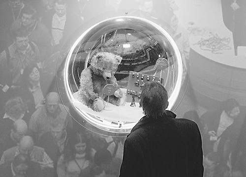 2月5日,在德国纽伦堡,一名参观者注视着一只泰迪熊。德国纽伦堡国际玩具博览会于当天开幕,来自60个国家和地区的约2700家厂商参展。